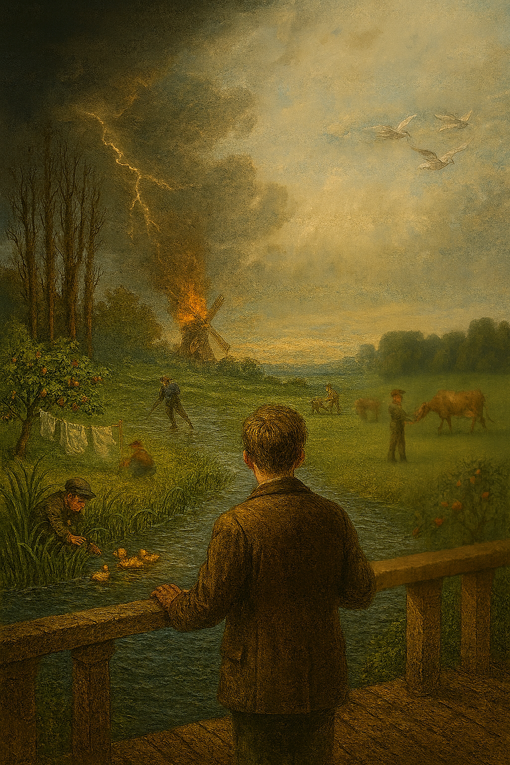 Zijn handen liggen op de leuning van de brug. Voor zijn geboorte was hier niets. Nu stroomt er water, schijnt er licht. Een jongen sluipt naar eendekuikens in het riet. Een schaatser legt zijn handen om een middel. Wat ooit gebeurde, is niet weg te denken. Wat niet is weg te denken, blijft gebeuren. De lucht is donker, achter kromme populieren slaat de bliksem krakend in en brandt een ogenblik een watermolen tot de grond toe af.